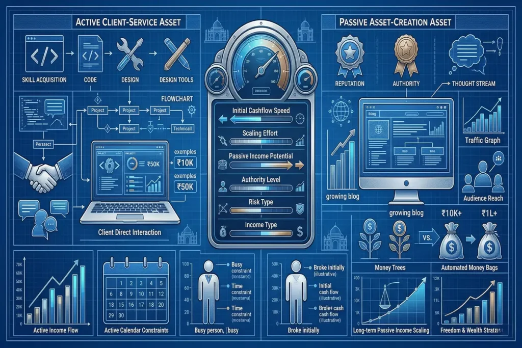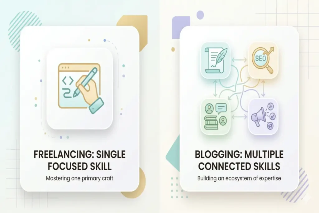 Freelancing vs blogging is a comparison between a service-based income model and a content-based asset model, where freelancing generates immediate active income and blogging builds long-term passive income.