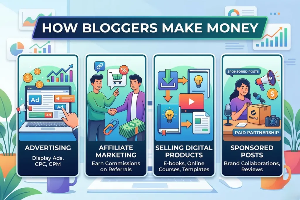 Yes. Bloggers earn money through ads, affiliate marketing, digital products, and sponsored content.